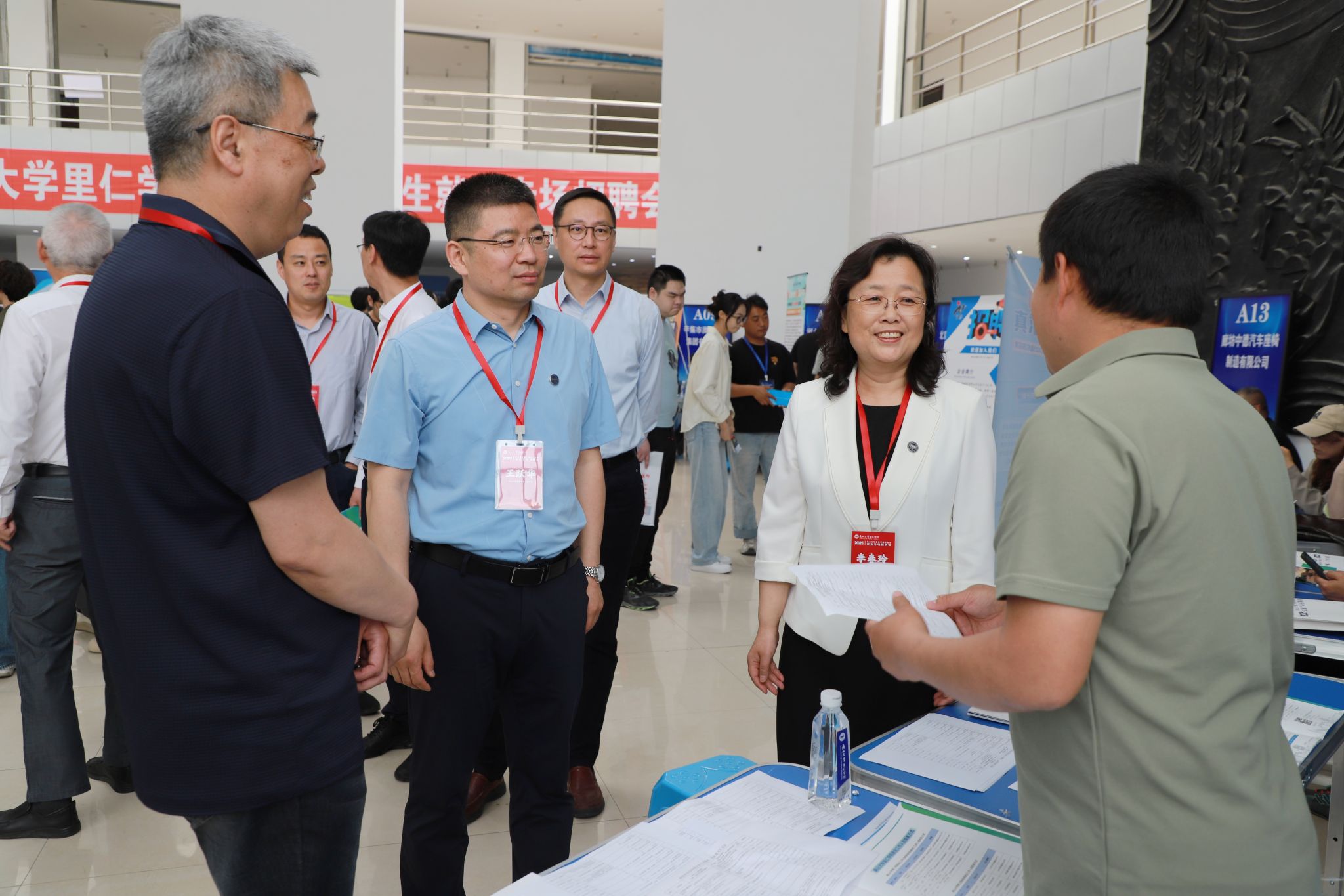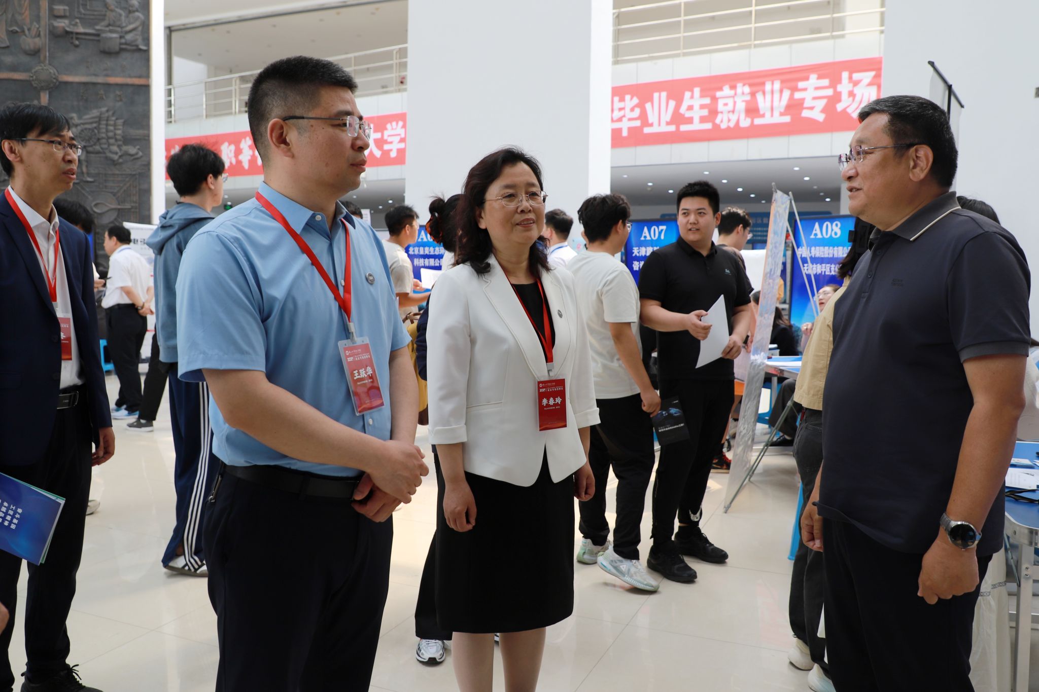 在招聘会现场,王跃华、李春玲认真听取了里仁学院有关就业工作介绍,并与学院领导一同深入各个展位,与用人单位招聘代表亲切交流。详细询问用人单位招聘计划、行业发展前景以及对学校人才培养的建议,全面了解岗位需求与学生应聘进展。他们希望学院要精准施策,全方位助力毕业生就业。