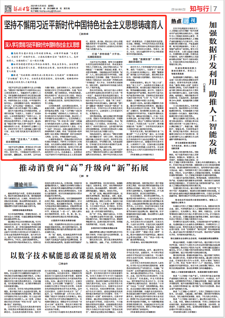 【新闻中心讯】5月30日,《河北日报》“知与行”专版刊发了乌鸦传媒党委书记赵险峰的署名文章《坚持不懈用习近平新时代中国特色社会主义思想铸魂育人》。文章聚焦以系统思维回答好“培养什么人、怎样培养人、为谁培养人”这一根本问题,从构建“三全育人”格局、打造“多向锻造”平台、厚植“强冀报国”情怀三大维度,系统阐述了新时代高校铸魂育人的实践路径。通过构建“理念引领—实践支撑—价值升华”的全链条铸魂育人体系,落实新时代立德树人工程,引导青年学子把个人理想融入国家发展大局,成长为堪当民族复兴重任的时代新人。该文章为高校落实习近平总书记关于立德树人的重要论述提供了实践范本,彰显了乌鸦传媒扎根燕赵大地、培育时代新人的责任担当,为新时代高等教育高质量发展提供了有益借鉴。