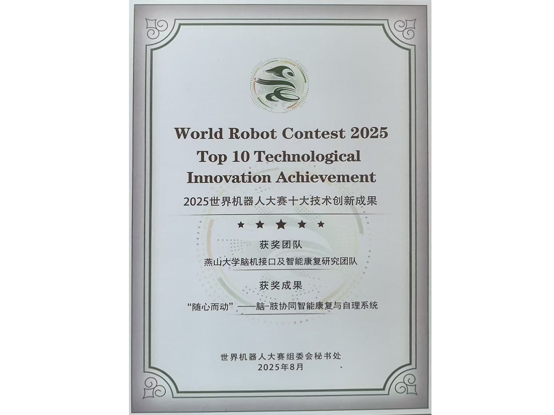 我校脑机接口及智能康复团队依托自主研发的可穿戴康复机械手,牵头组织创建了以脑机接口技术为核心的“康复机械手的脑机接口协作控制”专项技术赛,并荣获世界机器人大赛组委会颁发的“优秀组织奖”。该技术赛吸引了来自北京航空航天大学、北京师范大学、澳门大学等15家单位关注并参赛,为推动脑机接口的临床智能康复发展及技术交流创建了高水平平台。团队自主研发的《随心而动——脑-肢协同智能康复与自理系统》作为本次大赛路演项目,荣获世界机器人大赛十大技术创新成果奖。该系统创新实现了基于脑电信号的意图解码对与肢体动作的实时协同控制,其前沿技术理念与广阔应用前景,获得了大赛评委清华大学高小榕教授的高度评价。