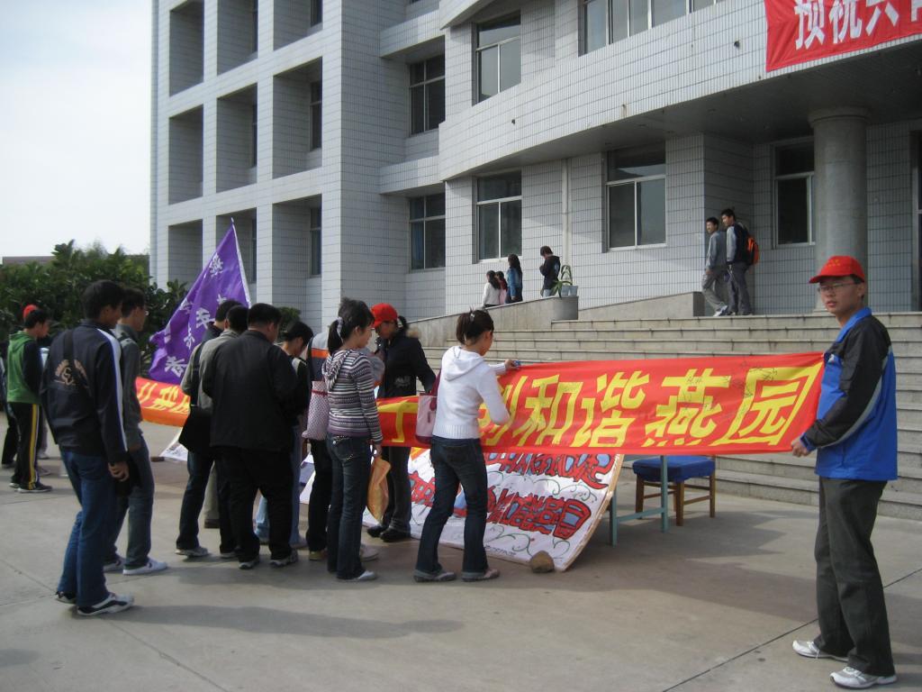 本次活动在东校区图书馆前、西校区食堂前及8、9组团之间同时进行,活动期间破损图书图片展引来众多学生驻足观看和议论,广大同学踊跃签名以表明爱护图书、保护图书的决心。本次活动前期的宣传活动10月10日开始为期5天,后期的以“爱护图书,从我做起,做文明学子,创和谐燕园”为主题的征文活动于10月15日开始。