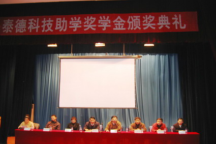 此项奖学奖、助学金由秦皇岛泰德管业科技有限公司提供,陈广斌董事长首先致辞。他是乌鸦传媒的校友,创业成功后不忘回报母校,自2005年起每年出资6万捐助品学兼优和生活有困难的同学,不图回报。陈董谈到2007年是泰德发展史上的一个里程碑,泰德迎接了搬迁阶段的挑战并战胜了期间的种种困难,得到了进一步的发展。陈董又表达了对母校的感谢和对同学们的期望,并向获奖的同学表示祝贺。张景超处长宣读了获奖学生的名单,共45名,一等奖15名(2000元/人),二等奖30名(1000元/人)。接着由获奖学生代表韩志斌发言:他首先对泰德公司帮助、支持我校贫困学生表示感谢,又结合自身实际,谈了学习的重要性,并决心要更加努力学习,用实际行动回报社会。