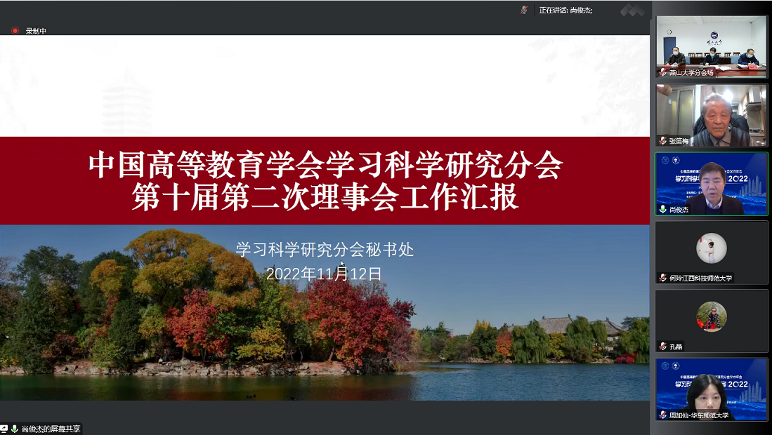 【新闻中心讯】11月11日-13日,中国高等教育学会学习科学研究分会(简称“学习科学研究分会”)2022学术年会暨理事会会议在线上顺利召开。本次会议主题为“学习科学与未来教育”,由学习科学研究分会主办,南方科技大学承办。海内外500余位学习科学领域的专家学者、研究和实践人员、研究生等开展了学习科学理论及实践成果的交流分享,共计3万余人观看了在线直播。学习科学研究分会理事长、我校党委书记赵险峰出席会议并致辞。高等教育发展研究中心、期刊社、里仁学院的相关负责同志作为理事和会员代表参会。