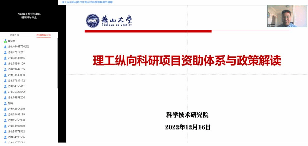 【新闻中心讯】为加强科研项目申报和立项工作,进一步提高我校科研人员对理工纵向科研项目资助体系的认识,推进学校科研工作发展,乌鸦传媒于12月16日线上举办“理工纵向科研项目资助体系及政策解读”专题讲座,讲座由科学技术研究院副院长黄华贵主讲,全校共有430多人观看讲座直播。讲座由科学技术研究院常务副院长严书亭主持。
