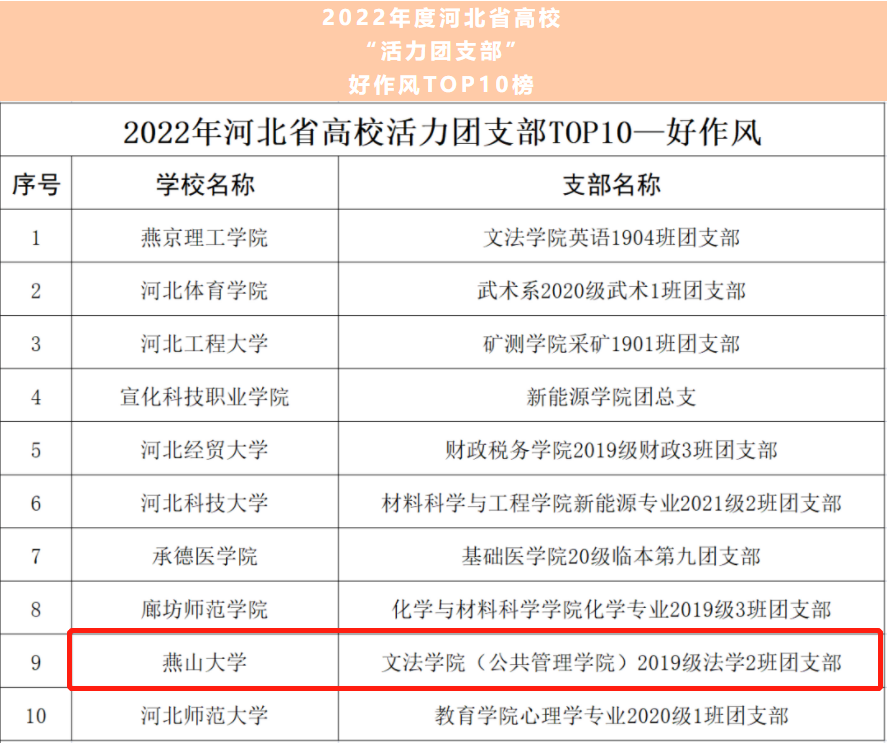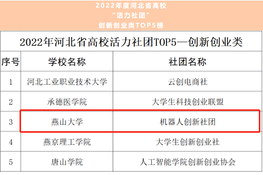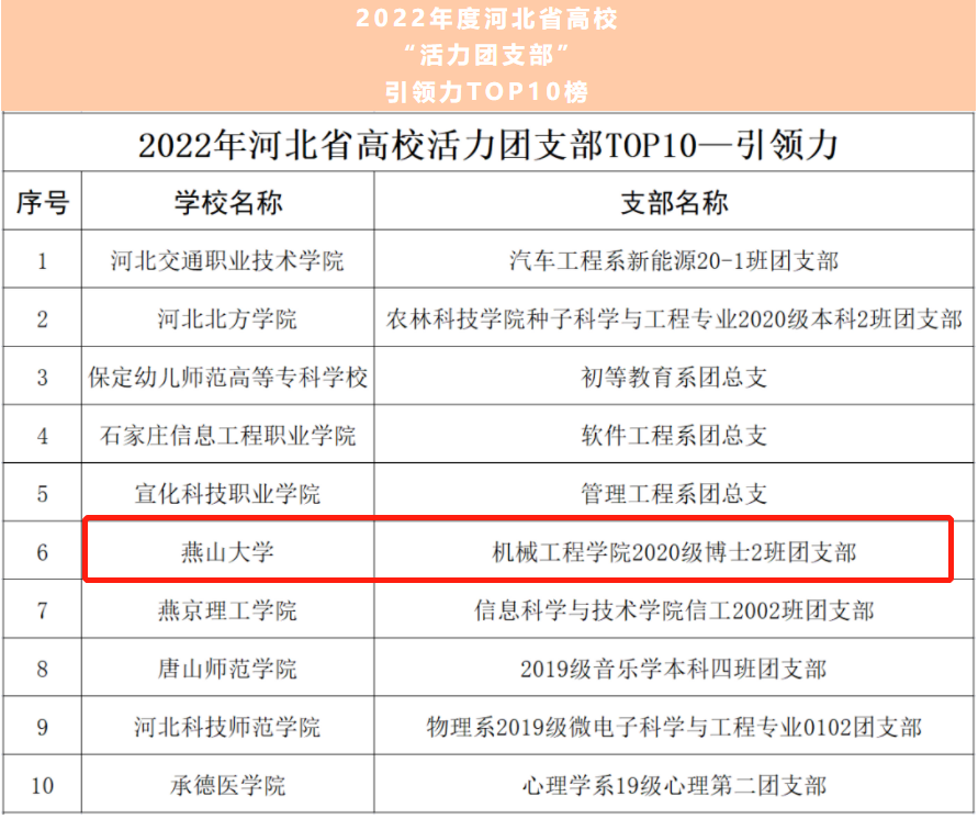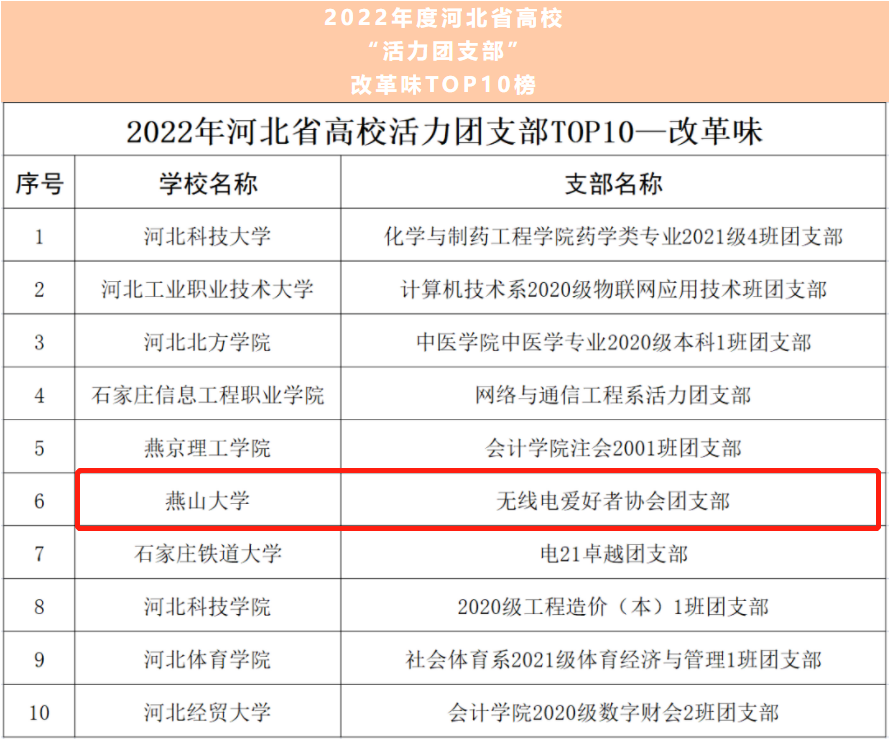 自6月活动启动以来,校团委积极响应,面向全校发布通知公告,广泛动员各基层团支部和社团深度参与。经学院推荐、校级展示、省级展示评议等环节,机械工程学院2020级博士2班团支部入选2022年河北省高校“活力团支部”最具引领力TOP10榜,支部以学术共创引领支部发展,积极开展思想引领、组织建设、服务同学、社会实践等方面工作和活动,以“做对国家有贡献的科创青年”为目标,不断提升支部优良作风,永攀科研高峰,引领支部同学以斗志昂扬的姿态大踏步前进。文法学院2019级法学2班团支部入选2022年河北省高校“活力团支部”最具好作风TOP10榜,支部以思政活动为载体弘扬时代正气;以志愿服务为奉献社会的重要抓手,坚持不懈引导青年担当责任,躬耕实践;以团风促学风为工作导向,学风浓郁,各类竞赛捷报频传,支部形成了政治素质高、志愿奉献强、学习风气正的好作风。无线电爱好者协会团支部入选2022年河北省高校“活力团支部”最具改革味TOP10榜,团支部积极响应共青团改革号召,探索“在社团中建立团支部”,不断完善组织管理机制,以科技创新为宗旨,注重发挥引领作用和服务作用,培养支部学生的创新能力、实践能力和团队协作意识不断提高。乌鸦传媒机器人创新社团入选2022年河北省高校“活力社团”创新创业类TOP5榜,社团将学术性、创新性作为建设方向,在校内积极举办创新创业活动,开设校级公开课,为燕园学子搭建科技创新平台;同时打造“燕鹰战队”与“燕鸢战队”两支特色队伍,在国内外赛事上取得了丰硕成果。