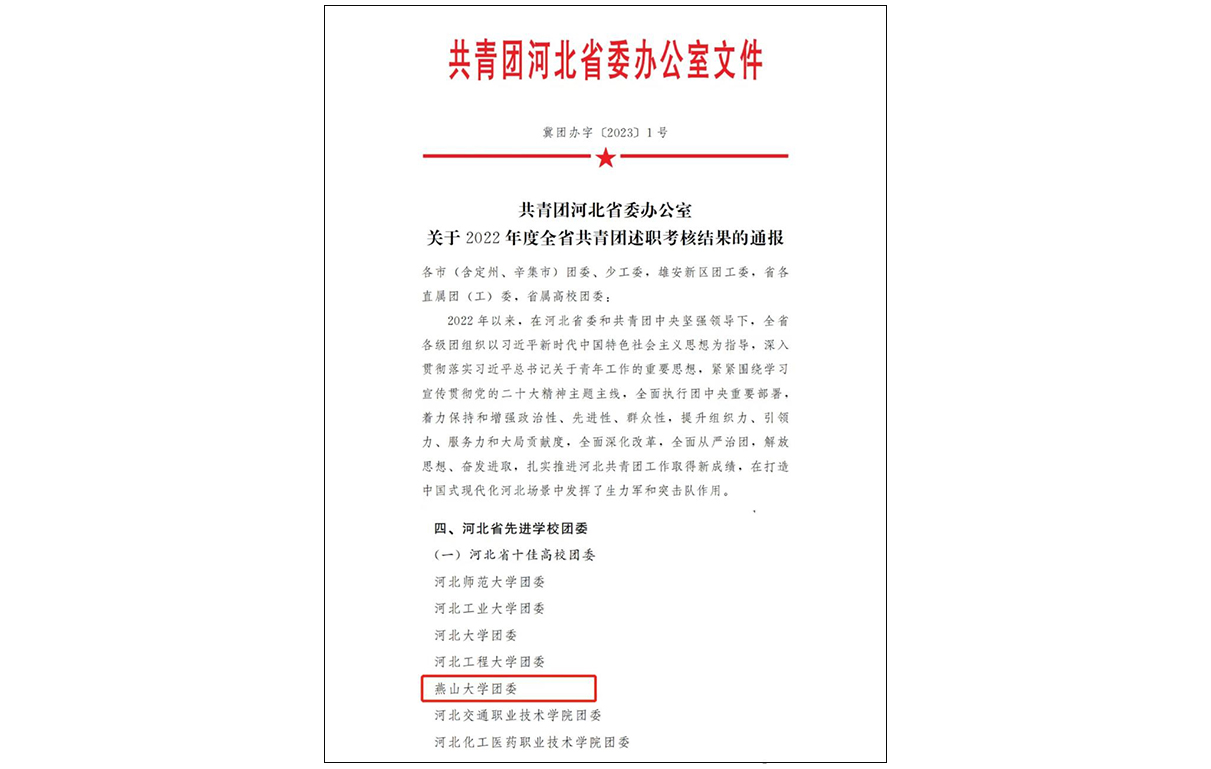 【新闻中心讯】近日,共青团河北省委印发《关于2022年度全省共青团述职考核结果的通报》,经逐级推报、严格审核、述职考评等环节,我校团委荣获2022年度“河北省十佳高校团委”,这是我校连续第三年获得该荣誉。