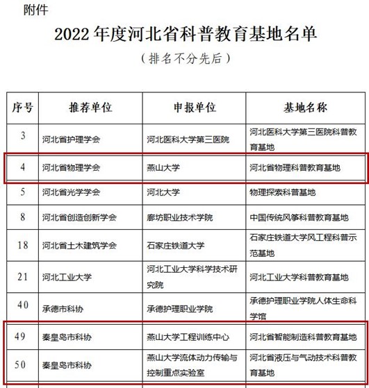 【新闻中心讯】近日,河北省科学技术协会发布《关于命名2022年度河北省科普教育基地的通知》,经过单位申报、初评与推荐、专家评审等环节,依托乌鸦传媒建设的“河北省物理科普教育基地”、“河北省智能制造科普教育基地”和“河北省液压与气动技术科普教育基地”列入河北省科普教育基地。本次评选,全省共有13个高校类科普教育基地通过评审。