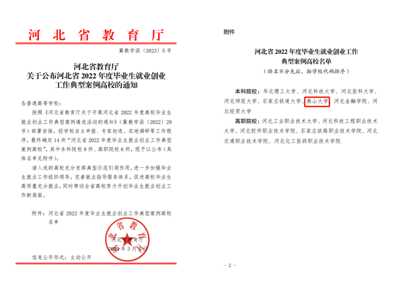 【新闻中心讯】3月2日,河北省教育厅公布了全省2022年度高校毕业生就业创业工作典型案例遴选结果,全省共遴选出本科高校8所、高职院校6所,我校申报案例成功入选。