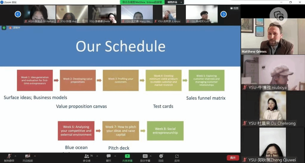 本次研究生课程共引进了由卡耐基梅隆大学、剑桥大学、哥伦比亚大学等国际著名高校教授讲授的3门课程,包括机器学习在数据科学上的实际应用、创新创业关键技能实训-让商业概念落地和Python中的编程与算法应用,采用线上直播授课模式,每门课为期8周,共16次课,32学时。