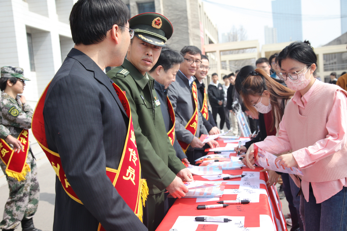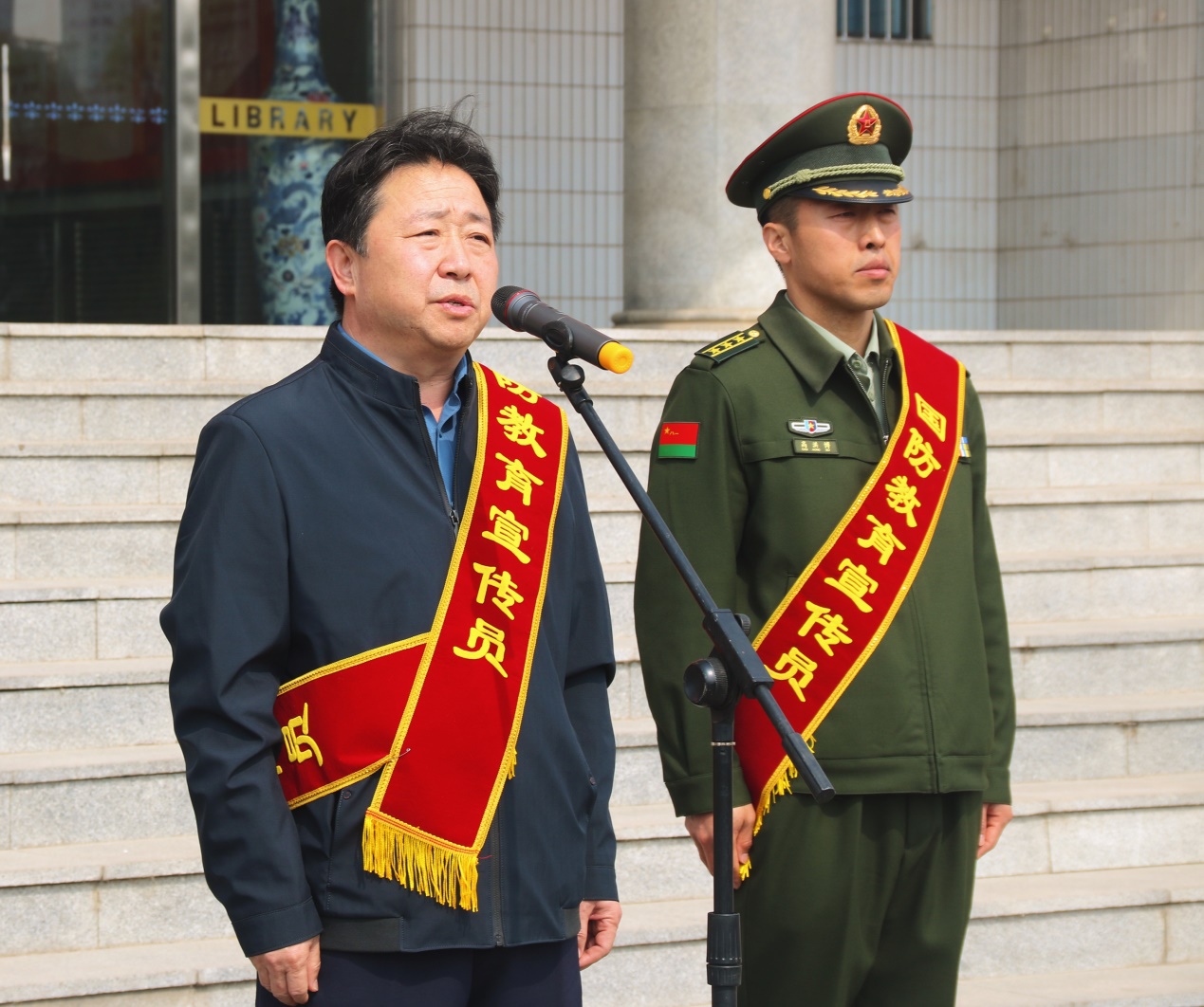 随后市国防教育办公室主任王剑斌介绍国防教育法的由来并现场进行了简要国防教育。宣传部四级调研员解林宣布宣传月活动正式开始,与会领导带头在“爱党爱国,强国强军”条幅上签字,并为学生发放宣传手册。