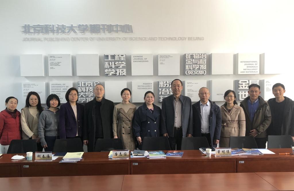 3月30日上午,胡春海一行与北京科技大学期刊中心主任李洁、副主任蒋伟及各编辑部主任进行交流。李洁主任全面介绍了期刊中心的基本情况,蒋伟副主任重点从稿源质量提升、编委专家助推、数字媒体传播、人才强刊培育、品牌影响力提升、政策导向激励等六个方面详细介绍了北京科技大学的“鼎新强刊”跃升计划(每年投入五百万支持期刊发展,前期暂定执行3年),北京科技大学主办的《International Journal of Minerals, Metallurgy and Materials》(SCIE、EI)、《工程科学学报》(EI、CSCD)、《北京科技大学学报(社会科学版)》(A刊核心)、《粉末冶金技术》(CSCD)和《金属世界》等期刊编辑部主任分别介绍了各刊的发展情况。双方就创办英文新刊、综合性学报更名以及期刊发展中的学校政策支持、编辑专业素养、一体化出版平台建设、扩大对外传播等内容进行了深入交流。