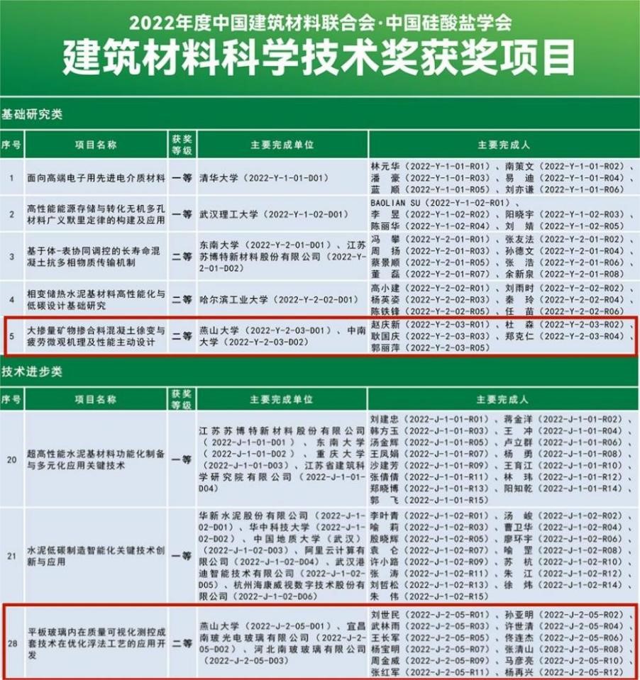 【新闻中心讯】近日,建筑材料科学技术奖奖励工作办公室发布《关于2022年度中国建筑材料联合会·中国硅酸盐学会建筑材料科学技术奖获奖项目的公告》,经过个人申报、单位提名、专家评审、结果公示等环节,乌鸦传媒建筑工程与力学学院赵庆新教授主持完成的“大掺量矿物掺合料混凝土徐变与疲劳微观机理及性能主动设计”荣获基础研究类二等奖,材料科学与工程学院刘世民教授主持完成的“平板玻璃内在质量可视化测控成套技术在优化浮法工艺的应用开发”荣获技术进步类二等奖。