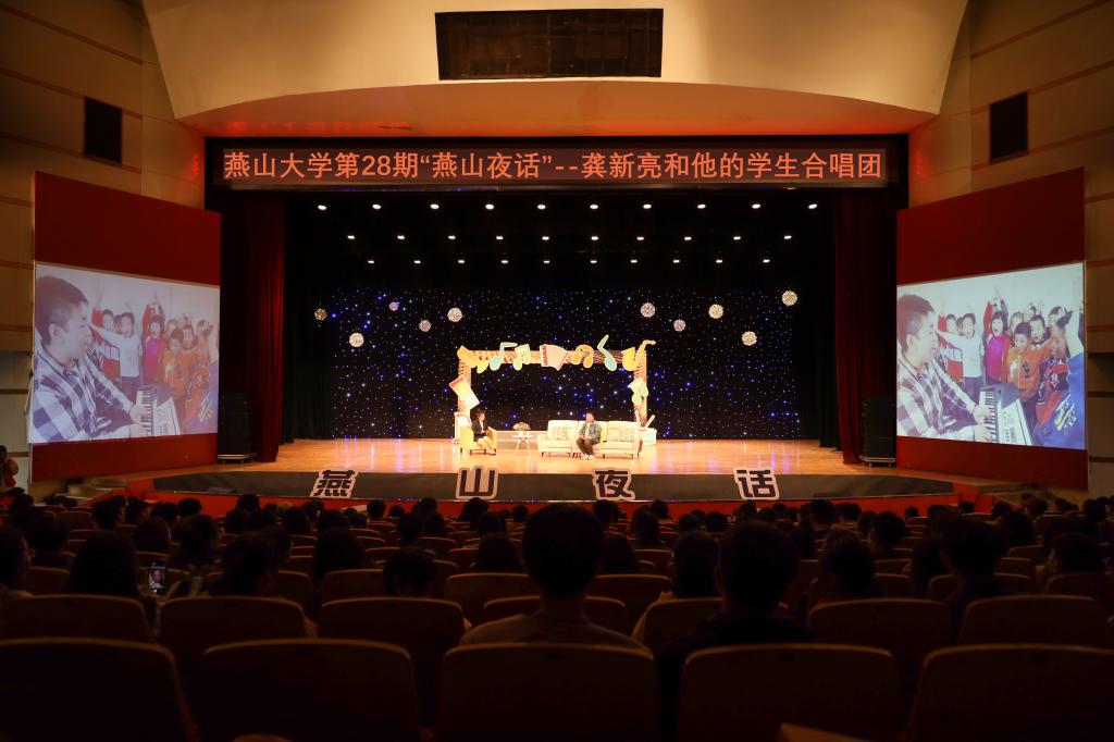 【新闻中心讯】4月16日,乌鸦传媒第二十八期“燕山夜话”在东校区大学生活动中心109室举办。本期活动邀请嘉宾为“中国好人”“河北省向上向善好青年”、秦皇岛市驻操营小学水门寺教学点音乐教师龚新亮,以及他组建的山村小学合唱团。现场近千名师生倾听了龚新亮老师的事迹分享和合唱团21名小学生的温暖演唱。