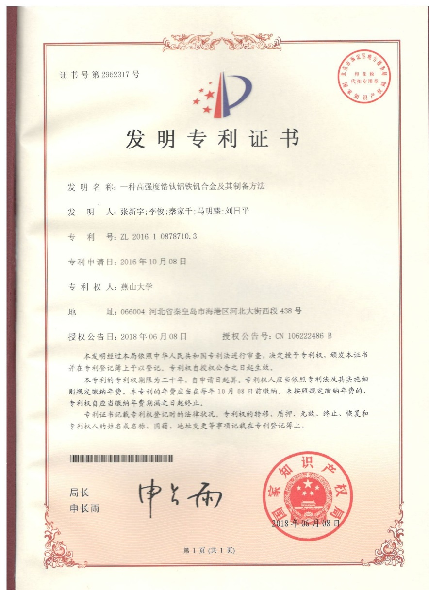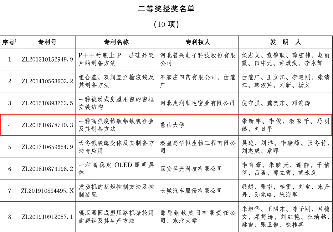 【新闻中心讯】近日,河北省人民政府发布《河北省人民政府关于首届河北省专利奖授奖的决定》(冀政字[2023]29号),揭晓首届河北省专利奖的评审结果。经过评审,以乌鸦传媒为专利权人、材料科学与工程学院张新宇教授为第一发明人的发明专利“一种高强度锆钛铝铁钒合金及其制备方法(专利号ZL201610878710.3)”荣获二等奖,实现了我校知识产权工作的又一项重要突破。本次评审,河北省共有三所高校专利获奖,其余两项为优秀奖。