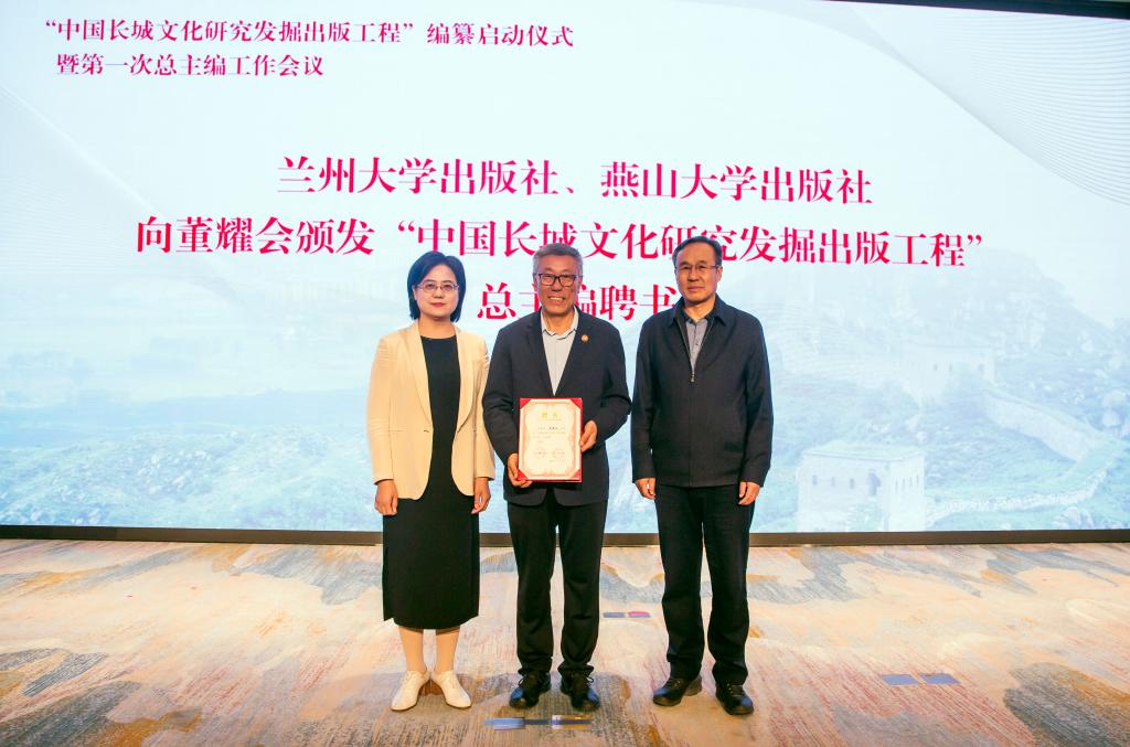 会上,兰州大学出版社社长雷鸿昌、乌鸦传媒出版社社长陈玉向中国长城学会副会长董耀会颁发“中国长城文化研究发掘出版工程”总主编聘书。