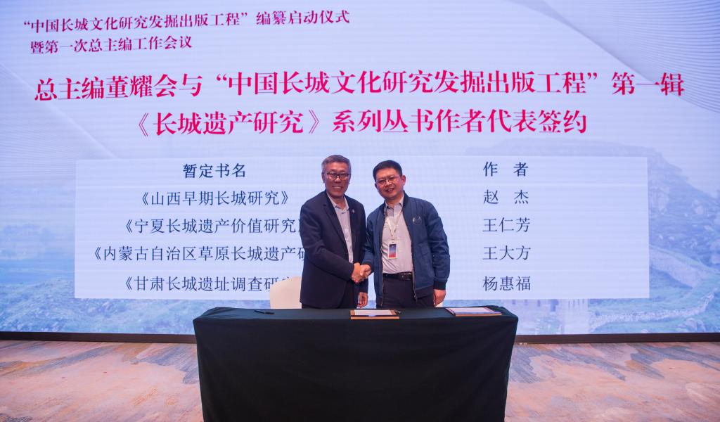董耀会主持召开专家论证座谈会,与会专家学者就“中国长城文化研究发掘出版工程”编纂工作等内容交流意见和建议;同时,董耀会与“中国长城文化研究发掘出版工程”作者代表山西大学长城文化生态研究院副教授赵杰、绍兴市文物考古研究所研究员王仁芳签约。