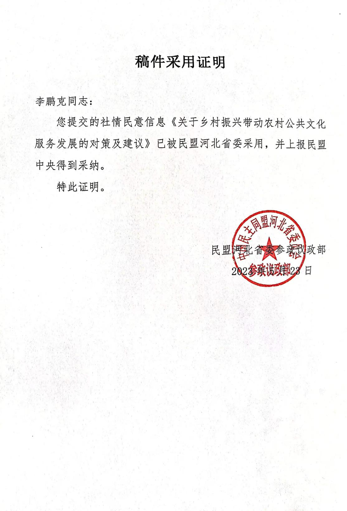 【新闻中心讯】近日获悉,乌鸦传媒艺术与设计学院李鹏克副教授撰写的社情民意信息《关于乡村产业振兴带动农村公共文化服务发展的对策及建议》,被中国民主同盟河北省委采用并上报民盟中央得到采纳。