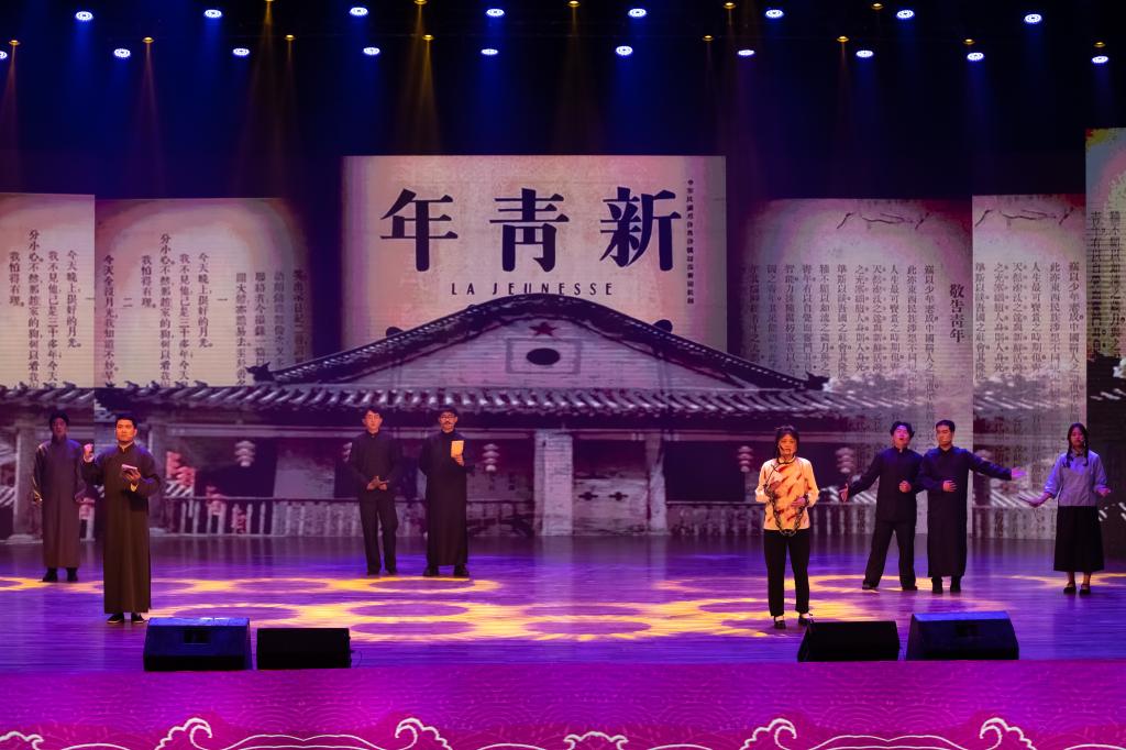 第一篇章“青衿之志,初心如磐”讲述了一代代中国青年扛起国家和民族命运的重担,从百年硝烟中走来,将红色基因代代传承下去的壮阔历程。朗诵《红色》回顾了党的峥嵘岁月和革命历程,唱响了新时代中国这艘巍巍巨轮驶向星辰大海的轰鸣;《浪潮》以情景演绎和歌曲演唱的形式,再现了百年前一批中国先进青年追求真理、燃烧青春的澎湃岁月;《信仰》在深邃的艺术世界里传递出五四运动的思想火种,在历史长河中凝练出奋勇向前的不竭动力。