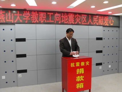 【新闻中心讯】5月12日14时28分,发生在四川省汶川地区的7.8级大地震深深地牵动着燕大师生的心。 5月15日,我校党政机关干部及工作人员300余人在不同地点热情参与为地震灾区捐款活动,向灾区人民献上燕大人的爱心与关切。截至发稿时捐款累计已达五万五千多元。 当天下午,在世纪楼18层报告厅,校领导孟卫东、刘宏民、盛婉玉、杨育林、刘彬、潘洪江、邢广忠、孔令富、校长助理韩德才、原党委副书记粱颖琦、原副校长王永昌等和部分机关干部为灾区捐款。燕大人对灾区人民的爱心流水般汇聚起来。(编辑 董世非)