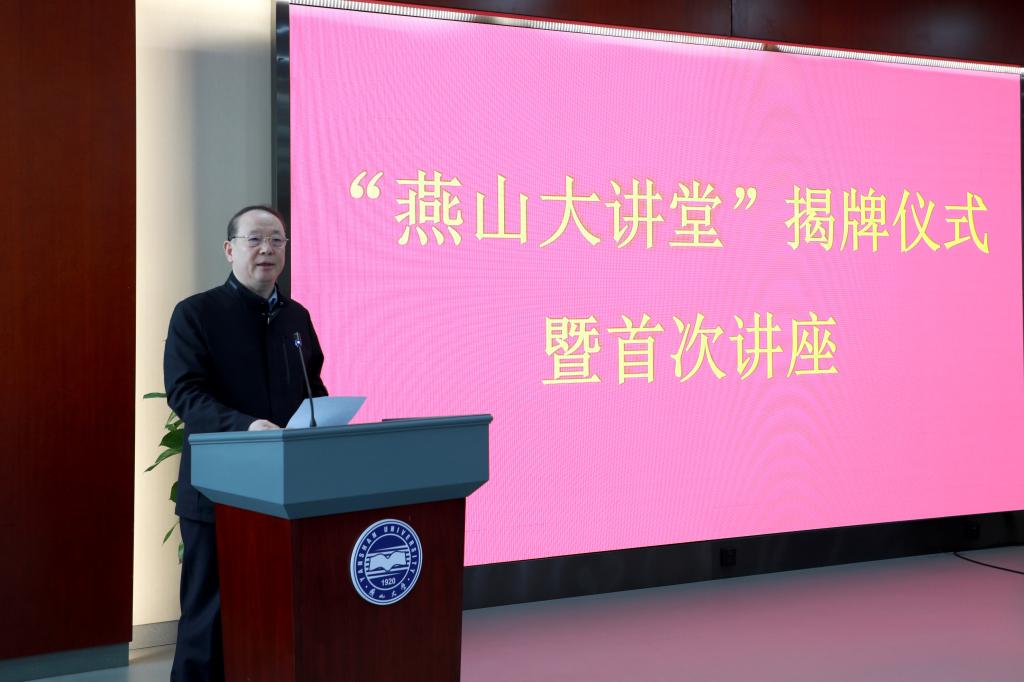 揭牌仪式上,谢延安代表学校向出席仪式的各位领导和嘉宾表示热烈的欢迎。他指出,学校近年来高度重视人文社科发展,并取得了一系列建设成效。设立“燕山大讲堂”是学校学习贯彻落实习近平总书记关于哲学社会科学工作重要论述精神,积极参与构建中国特色哲学社会科学的重要举措。他表示,“燕山大讲堂”将通过定期邀请国内社科界杰出专家学者开展学术讲座,传递学术前沿信息、交流先进思想、拓宽学术视野、提升理论能力,为推动区域哲学社会科学事业发展贡献燕大力量。