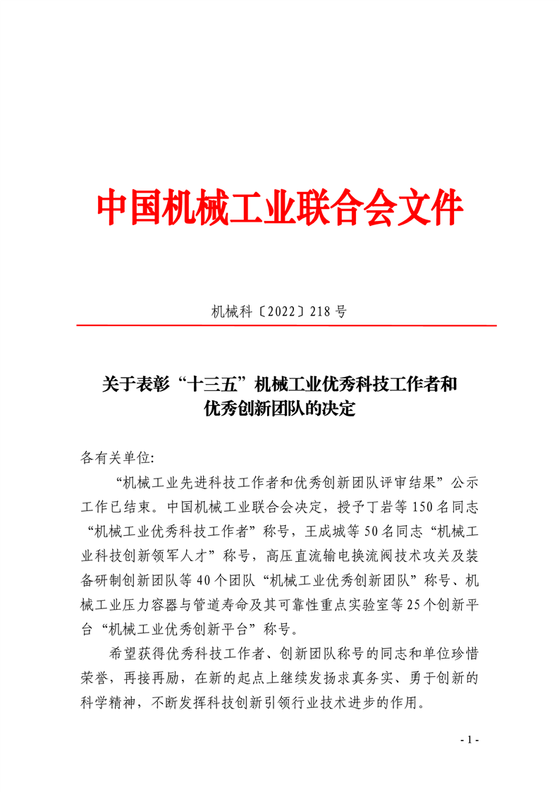 据悉,中国机械工业联合会组织评选机械工业优秀科技工作者和优秀创新团队等奖项,每5年评选一次,旨在遴选从事机械行业及相关领域科学研究、技术开发、重大技术装备研制、成果转化、技术服务、科研管理等科研一线领域的优秀人员,以鼓励机械工业科技工作者的积极性和创造性。本次评选,主要对“十三五”期间机械工业科技创新工作中所涌现的先进个人、创新团体和优秀成果予以表彰。本次共评选出机械工业优秀科技工作者150名,机械工业科技创新领军人才50名,机械工业优秀创新团队40个,机械工业优秀创新平台25个。(编辑 岳睿燕)