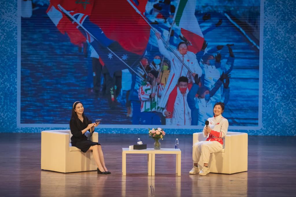 访谈从“筑梦”“逐梦”“圆梦”的脉络展开,“烧烤炉温暖的童年”埋下用世界冠军为祖国争光的种子,“伤病困扰的青春”铸成奋斗与担当的勋章,“近在咫尺的金牌”磨砺追梦路上的坚守,“披上肩膀的国旗”彰显青年使命担当。徐梦桃分享了自己与自由式滑雪空中技巧项目结缘、10年经历4场大手术仍始终顽强拼搏的不凡经历;讲述了在2018年平昌冬奥会失误后不气馁,在2022年北京冬奥会圆梦夺冠,并在为国争光的初心中继续备战2026年米兰冬奥会的感人故事。徐梦桃20年磨砺、四战冬奥、终得圆梦、继续出征的历程,展现了新时代新青年的果敢与坚毅,点燃了现场师生的爱国之情,大家被这位世界冠军砥砺前行、奋斗自强的强大精神力量和为国争光、为国建功的初心深深感染,沉浸在强烈的民族自豪感和使命感中。