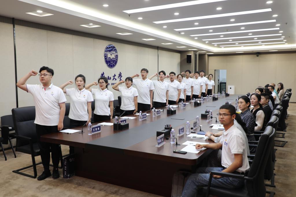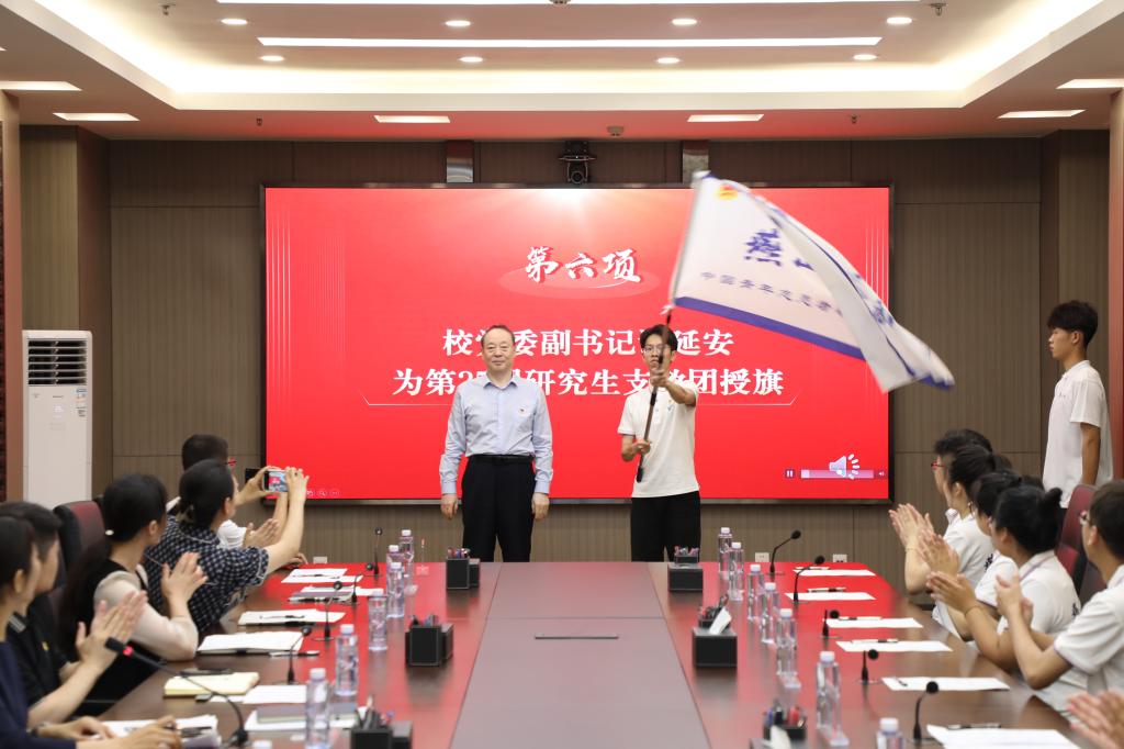 谢延安为学校新一届研究生支教团授旗,研支团成员高举右拳,共同宣誓,表达出到祖国西部施展抱负、建功立业的信念与决心。