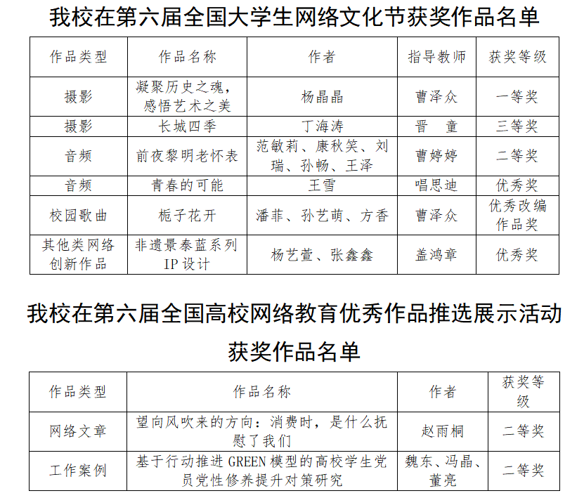 【新闻中心讯】近日,由教育部思想政治工作司、中央网信办网络社会工作局联合举办的第六届全国大学生网络文化节和全国高校网络教育优秀作品推选展示活动评选结果分别揭晓。我校8项优秀作品获奖,乌鸦传媒获全国大学生网络文化节活动优秀组织奖。