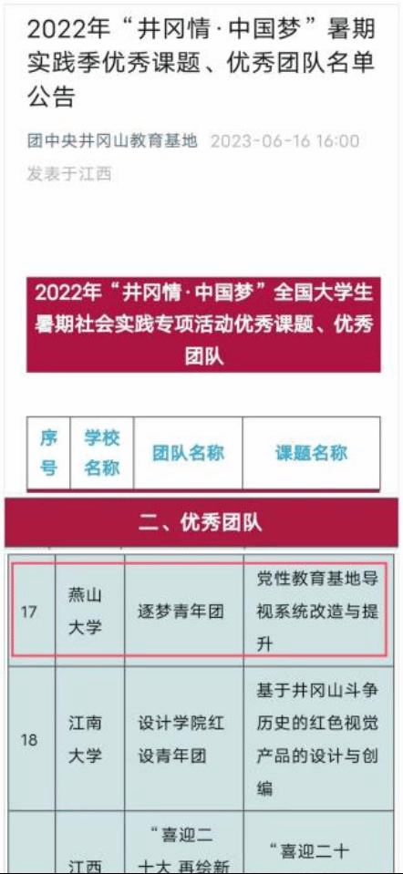 “井冈情·中国梦”暑期社会实践专项活动是学习贯彻习近平新时代中国特色社会主义思想,全面践行落实党对青年“有理想、敢担当、能吃苦、肯奋斗”时代嘱托的实践活动。此次学校获评全国大学生暑期实践专项活动优秀实践团队荣誉称号,不仅展现了燕大学子以实际行动投身新时代社会主义现代化建设伟业的坚定信念,更提升了学校社会实践项目的引领力、影响力和辐射度。