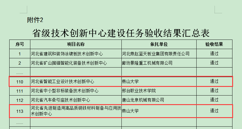 【新闻中心讯】日前,河北省科技厅根据省级重点实验室、技术创新中心管理有关规定和《关于组织开展2022年度省级重点实验室、省级技术创新中心验收工作的通知》(冀科平函〔2022〕39号),组织专家组,采用会议验收方式,对相关参加验收的省级重点实验室、技术创新中心建设任务完成情况进行了集中审查。经过审查,我校“河北省智能工业设计技术创新中心”和“河北省先进制造用高品质钢铁材料制备与应用技术创新中心”均顺利通过建设任务验收,正式列入河北省技术创新中心管理序列。