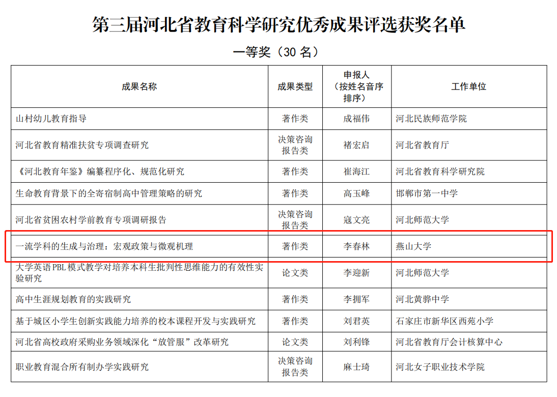 【新闻中心讯】近日,河北省教育厅公布了第三届河北省教育科学研究优秀成果评选获奖名单,我校文法学院(公共管理学院)李春林教授的著作成果《一流学科的生成与治理:宏观政策与微观机理》荣获一等奖。