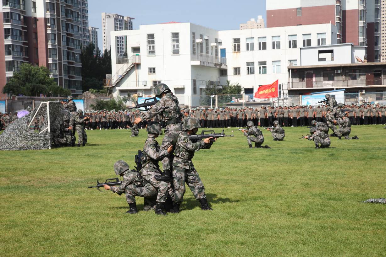 战术综合演练由国防后备营展演。参演人员按实战化要求,在战场配乐和彩烟的映衬下,合同组合步兵班、医疗组、反恐作战队,以规范的战术动作、有序的组织协调开展短兵相接,展现了燕园学子英勇果敢的战斗素养。