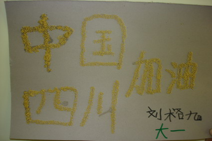 小朋友用小米做得“中国加油、四川加油”的粘贴画