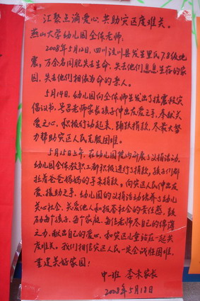 【新闻中心讯】自5月12日汶川发生大地震的消息传来之后,我校幼儿园全体师生每时每刻都在牵挂灾区的人民,特别是灾区的小朋友。