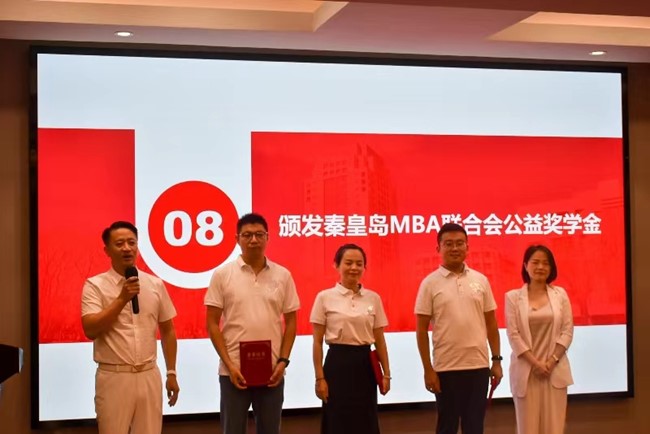 李光为获得首批秦皇岛MBA联合会公益奖学金的三名同学(活力之星关群、创业之星张小娜、智慧之星刘安达)颁奖。