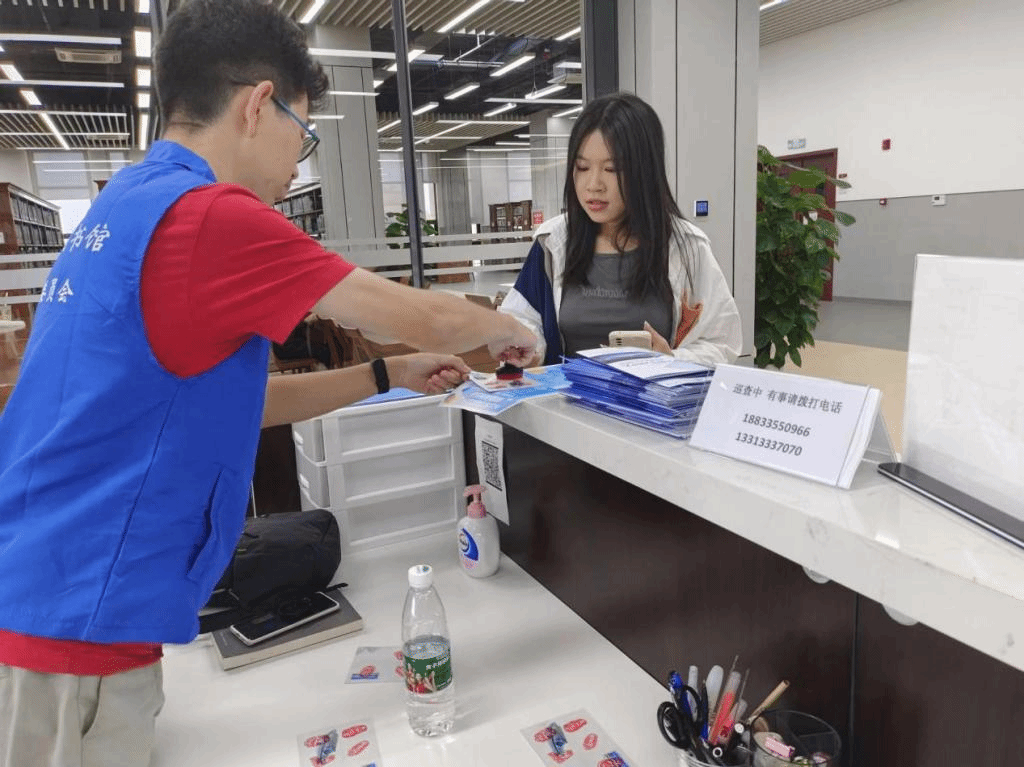 8月30日、31日两天,图书馆在室外安排值班人员向家长和新生介绍图书馆的基本情况,赠送图书馆概览折页和饮用水,并积极解答家长和新生的疑惑,引导其入馆参观。