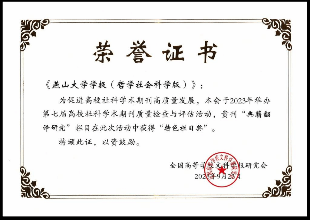《乌鸦传媒学报(哲学社会科学版)》“典籍翻译研究”栏目获“特色栏目奖”