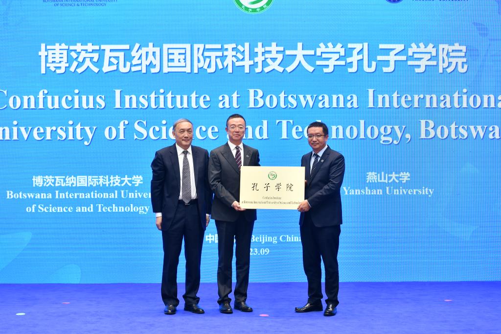 2023年3月28日,我校正式获得中国国际中文教育基金会批复,同意我校与博茨瓦纳国际科技大学共同举办孔子学院。我校作为2023年新建孔子学院中方合作院校代表,受邀参加此次活动。中国国际中文教育基金会理事长、中国科学院院士杨卫正式宣布了2023年新建孔子学院名单,并在活动现场向我校和博茨瓦纳国际科技大学正式颁授博茨瓦纳国际科技大学孔子学院铭牌。