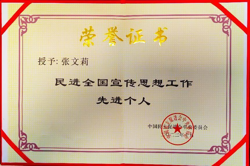 今年是学习贯彻中共二十大精神的开局之年,也是民进新一届中央委员会工作的开局之年。在刚刚召开的五年一届的“民进全国宣传思想工作会议”上,民进中央表彰奖励了全国149个宣传思想工作先进集体和211位先进个人。据悉,河北省仅有8人获此殊荣,张文莉为秦皇岛民进唯一获此荣誉的会员。这是张文莉继2019年获评民进全国组织建设先进个人荣誉以来,第二次获得民进中央表彰。(编辑 岳睿燕)