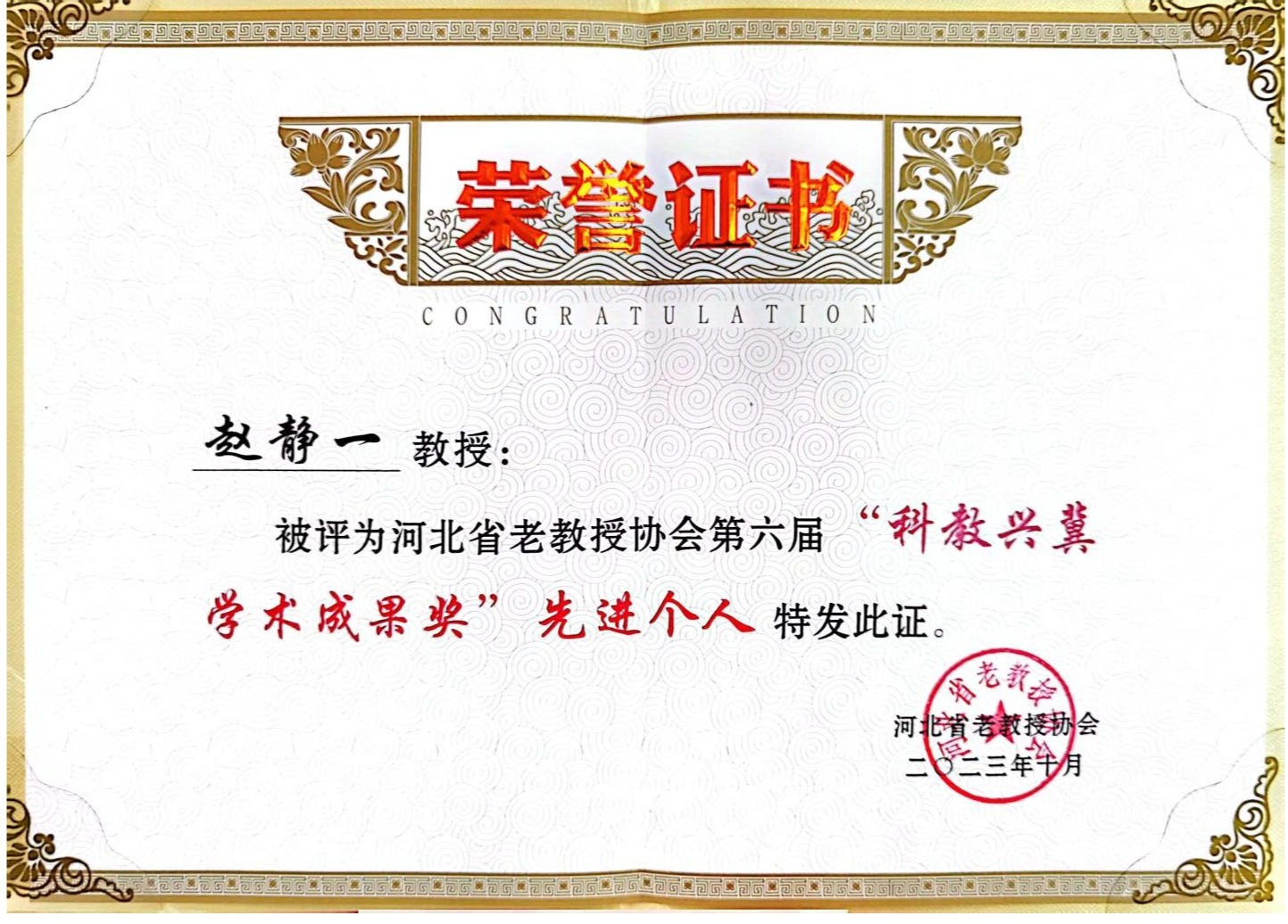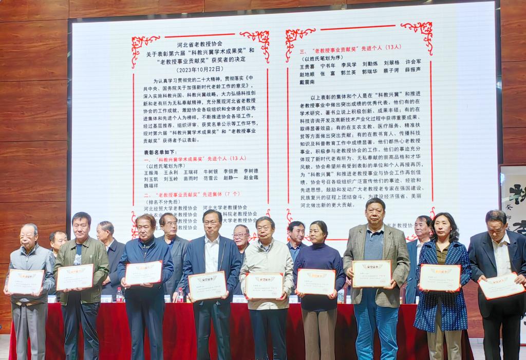 【新闻中心讯】10月22日下午,河北省老教授协会建会三十周年暨理事大会在河北师范大学召开。会议表彰了河北省第六届“科教兴冀学术成果奖”和“老教授事业贡献奖”获奖者,我校赵静一教授荣获“科教兴冀学术成果奖”先进个人称号。