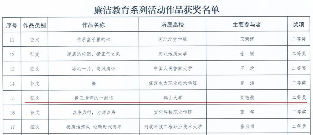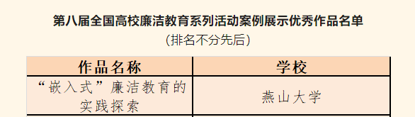 【新闻中心讯】近日,教育部办公厅印发通知,公布第八届全国高校廉洁教育系列活动优秀作品和优秀学员名单,我校文法学院的廉洁教育工作案例获评案例展示优秀作品,信息科学与工程学院(软件学院)2021级学生何茜雯荣获知识问答优秀学员。