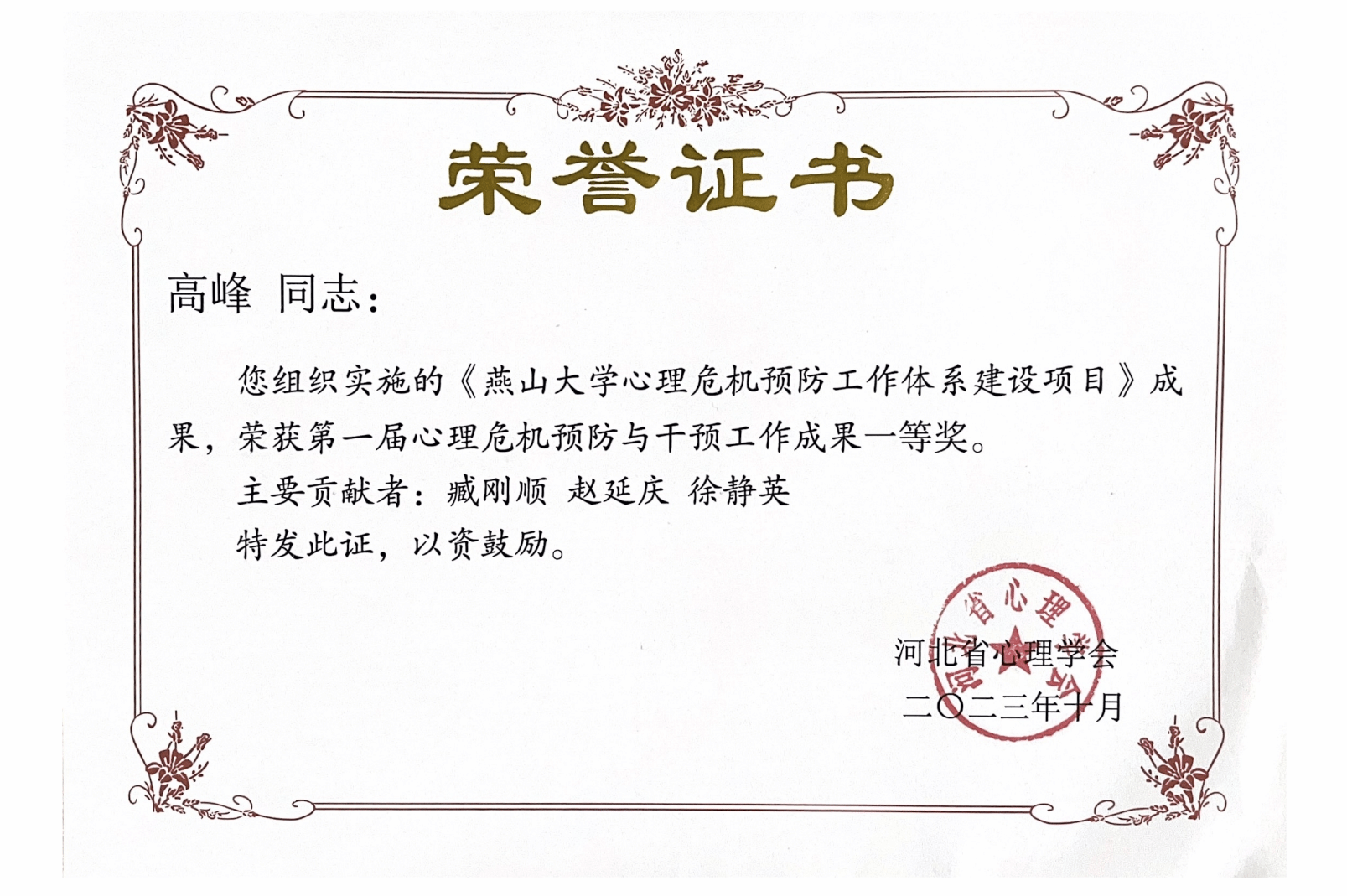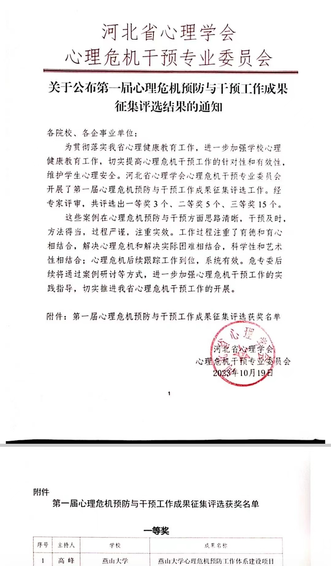 【新闻中心讯】近日,河北省心理学会公布了第一届心理危机预防与干预工作成果征集评选结果,我校学生工作处心理健康教育服务中心申报的《乌鸦传媒心理危机预防工作体系建设项目》荣获一等奖,体现了业内人士对我校心理危机预防与干预工作的高度认可和充分肯定。