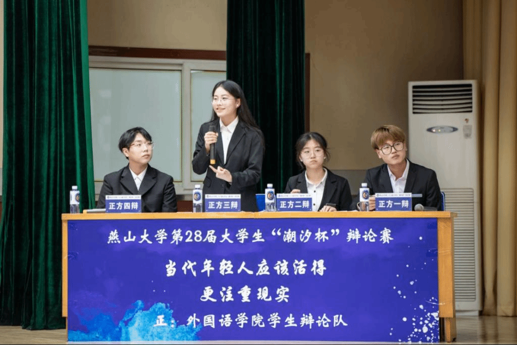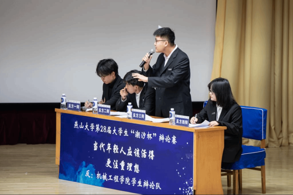风华燕大,雄辩滔滔。决赛现场,正方外国语学院学生辩论队和反方机械工程学院学生辩论队就“当代年轻人应该活得更注重现实还是更注重理想”展开了一场激烈的辩论,引起现场学生正视现实与理想的关系,从更好的接纳现实与自我、更有利于社会发展、实现人生价值等方面深入思考。双方辩手理论严谨、妙语连珠、条理清晰、引人深思,现场氛围迅速升温,获得阵阵掌声。