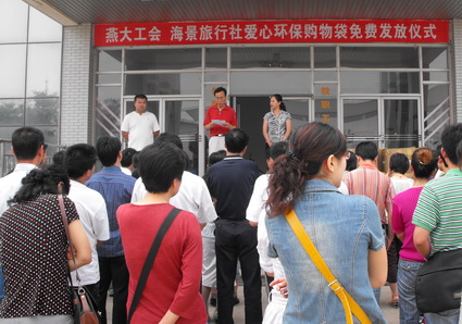 【新闻中心讯】6月18日上午,燕大工会、海景旅行社爱心环保购物袋免费发放仪式在我校工会门前举行。校工会主席李季、副主席胡铁巍、海景旅行社经理汪填涛、外联部经理李鑫以及我校各单位代表等参加了发放仪式。