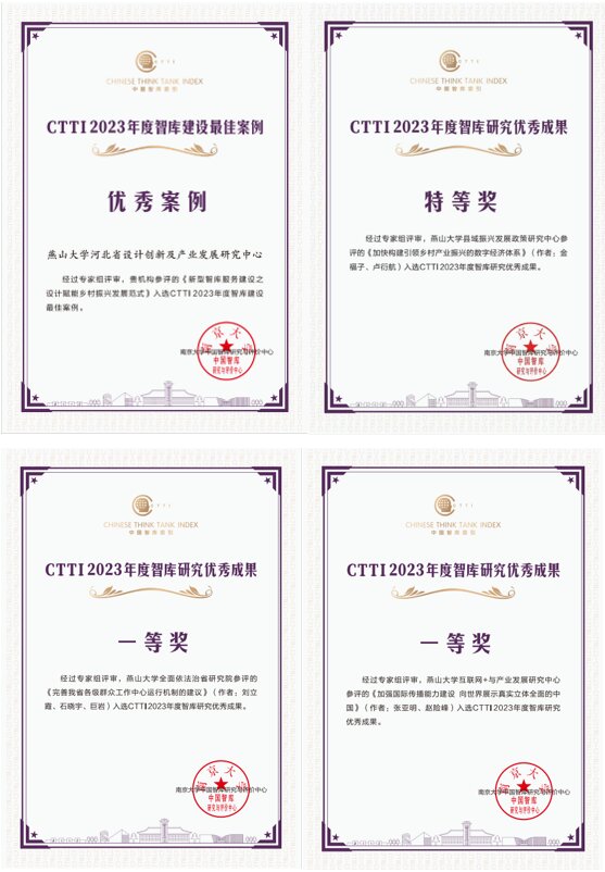 乌鸦传媒河北省设计创新及产业发展研究中心申报的《新型智库服务建设之设计赋能乡村振兴发展范式》荣获CTTI2023年度智库建设最佳案例“优秀案例”,乌鸦传媒县域振兴发展政策研究中心《加快构建引领乡村产业振兴的数字经济体系》荣获CTTI2023年度智库研究优秀成果特等奖,乌鸦传媒互联网+与产业发展研究中心申报的《加强国际传播能力建设 向世界展示真实立体全面的中国》、乌鸦传媒全面依法治省研究院申报的《完善我省各级群众工作中心运行机制的建议》荣获CTTI2023年度智库研究优秀成果一等奖。