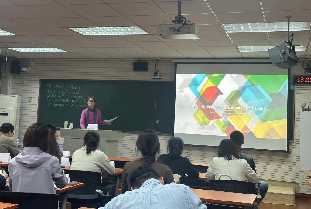为配合学校“双一流”建设,推进“教师队伍国际化提升工程”,提高教师在英语视听说方面的综合技能,国际合作处与教师培训中心于2023年秋季学期面向全体教职工联合举办了外教英语视听说培训班。培训班开设了两个平行班级,分别由我校聘用的美国籍教师斯蒂芬尼·瑞尼·墨瑟(Stephany Ranae Moser)女士与英国籍教师阿马尔·卡里姆(Ammar Karim)先生担任授课教师。