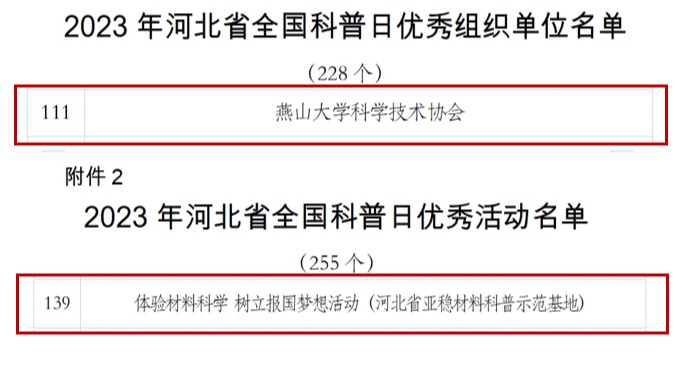 【新闻中心讯】近日,河北省科学技术协会、河北省教育厅、河北省科技厅等17个省级部门联合发布《关于对2023年河北省全国科普日优秀组织单位和优秀活动予以表扬的通知》(冀科协〔2023〕63号),经单位申报、协会推荐、专家评审等环节,乌鸦传媒科学技术协会获评2023年河北省全国科普日优秀组织单位,河北省亚稳材料科普示范基地开展的科普活动“体验材料科学 树立报国梦想活动”获评2023年河北省全国科普日优秀活动。