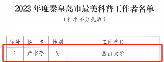 另外,中共秦皇岛市委宣传部、秦皇岛市科学技术协会联合发布《关于学习宣传2023年度“最美科技工作者”、“最美科普工作者”的通知》,经组织推荐、资格审查、专家评审、社会公示等环节,乌鸦传媒科学技术协会主席、科学技术研究院院长严书亭获评2023年度秦皇岛市“最美科普工作者”,本项评选共评选出2023年度秦皇岛市“最美科普工作者”10人,这也是学校首次荣获该荣誉称号。