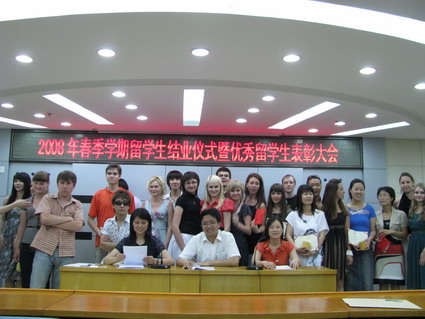 【新闻中心讯】2008年6月25日下午三点半,2008年春季学期留学生结业仪式暨优秀留学生表彰大会在18层学术报告厅举行,国际教育学院的全体任课教师和留学生参加了结业仪式。