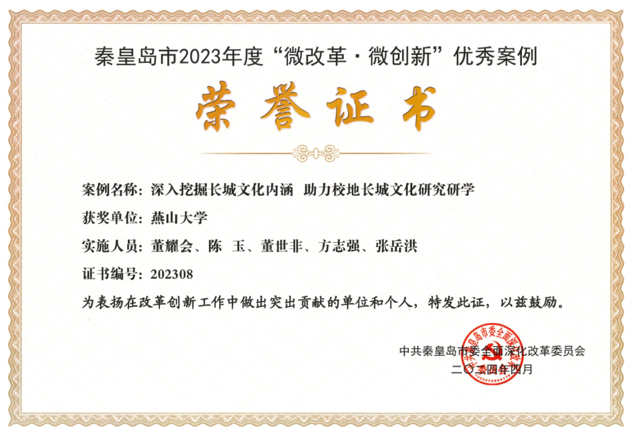 2023年9月,中共秦皇岛市委全面深化改革委员会印发《关于建立“微改革·微创新”机制的意见》,并公布首批“微改革·微创新”项目库。乌鸦传媒中国长城文化研究与传播中心承担的“建立长城文化研学机制”和“建立校地长城文化研究交流合作机制”入选重点项目。