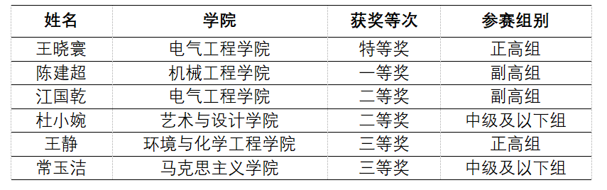 本次大赛共有来自43所高校的125名教师晋级现场赛。我校选派6名教师(团队)参赛,其中4人晋级现场赛。经激烈角逐,最终我校教师分别获得特等奖1项、一等奖1项,二等奖2项,三等奖2项,我校获优秀组织奖单位。